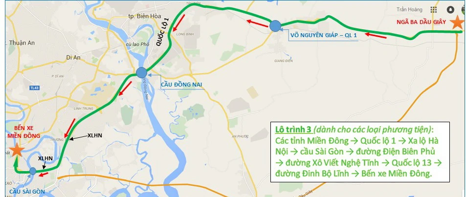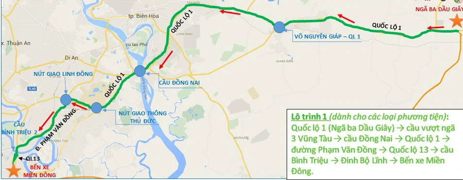 Lộ trình 1 (dành cho các loại phương tiện): Quốc lộ 1 (ngã ba Dầu Giây) → cầu vượt ngã ba Vũng Tàu → cầu Đồng Nai → quốc lộ 1 → đường Phạm Văn Đồng → quốc lộ 13 → cầu Bình Triệu → Đinh Bộ Lĩnh → Bến xe Miền Đông.