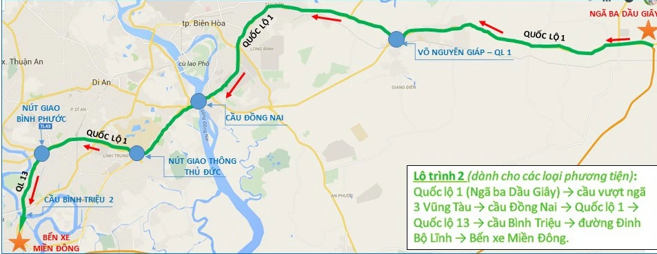 Lộ trình 2 (dành cho các loại phương tiện): Bến xe Miền Đông → quốc lộ 13 → cầu Bình Triệu → quốc lộ 13 → quốc lộ 1 → cầu Đồng Nai → cầu vượt ngã ba Vũng Tàu → quốc lộ 1 (ngã ba Dầu Giây).