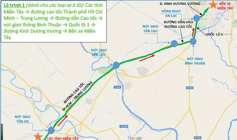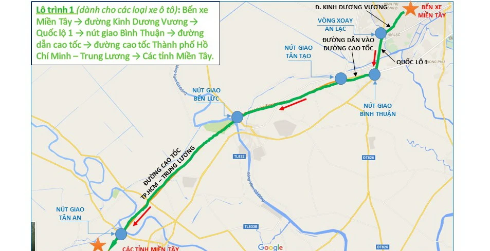 Lộ trình 1 (dành cho các loại ô tô): Bến xe Miền Tây → đường Kinh Dương Vương → quốc lộ 1 → nút giao Bình Thuận → đường dẫn cao tốc → đường cao tốc TP.HCM - Trung Lương → các tỉnh miền Tây.
