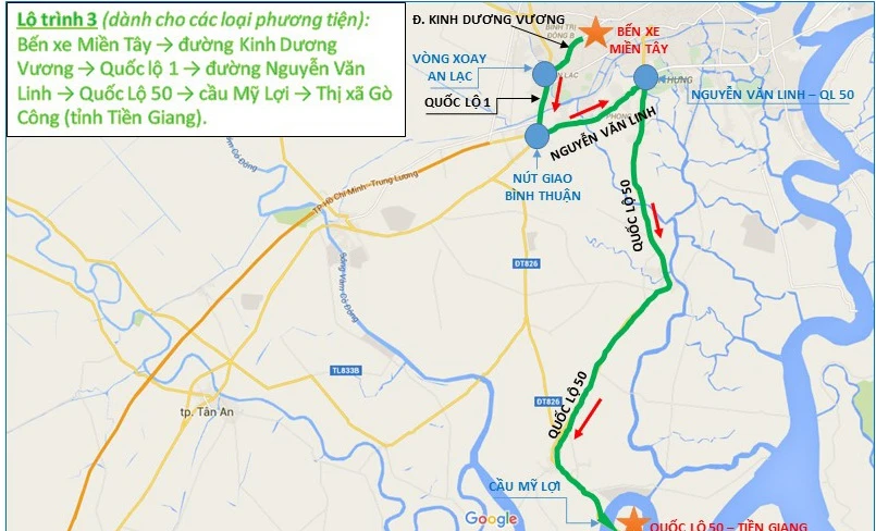 Lộ trình 3 (dành cho các loại phương tiện): Bến xe Miền Tây → đường Kinh Dương Vương → quốc lộ 1 → đường Nguyễn Văn Linh → quốc Lộ 50 → cầu Mỹ Lợi → thị xã Gò Công (Tiền Giang).