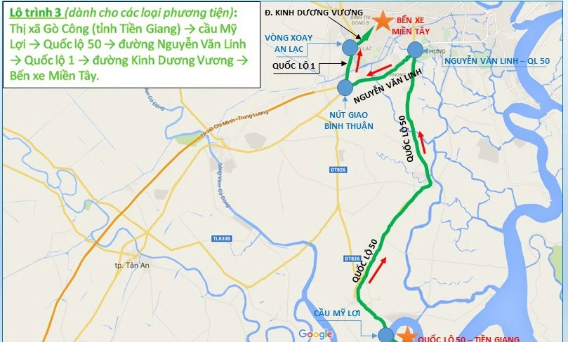 Lộ trình 3 (dành cho các loại phương tiện): Thị xã Gò Công (Tiền Giang) → cầu Mỹ Lợi → quốc lộ 50 → đường Nguyễn Văn Linh → quốc lộ 1 → đường Kinh Dương Vương → Bến xe Miền Tây.