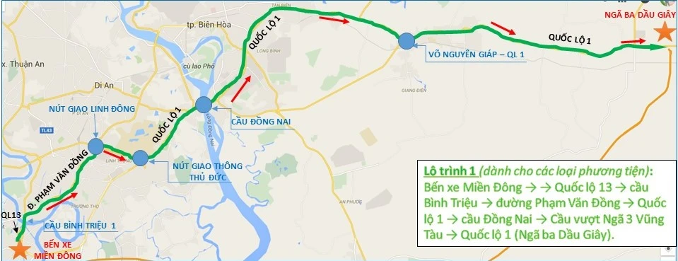 Lộ trình 1 (dành cho các loại phương tiện): Bến xe Miền Đông → quốc lộ 13 → cầu Bình Triệu → đường Phạm Văn Đồng → quốc lộ 1 → cầu Đồng Nai → cầu vượt ngã ba Vũng Tàu → quốc lộ 1 (ngã ba Dầu Giây).