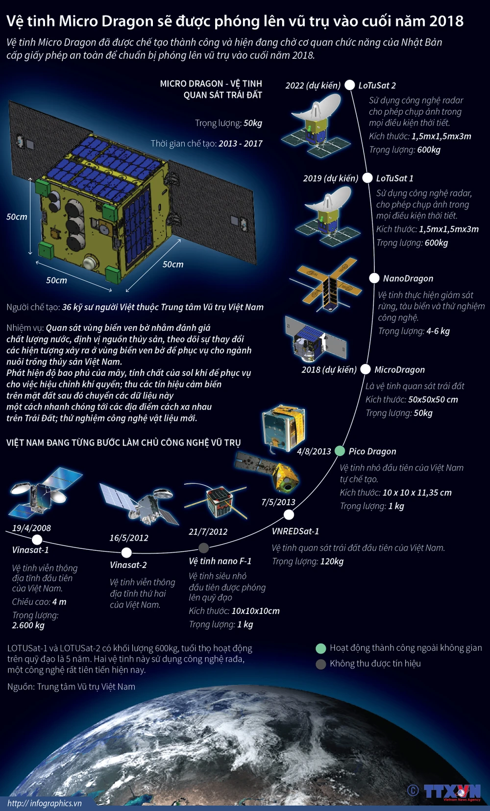 Vệ tinh Micro Dragon đã được Việt Nam chế tạo thành công và hiện đang chờ cơ quan chức năng của Nhật Bản cấp giấy phép an toàn để chuẩn bị phóng lên vũ trụ vào cuối năm 2018.