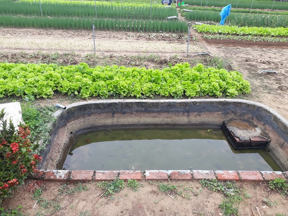 Đầu mỗi vạt rau, lác đác mấy cái máng vôi cạn trẹt hình chữ nhật vát tròn các góc để chứa nước. Ảnh: CHẾ DIỄM TRÂM