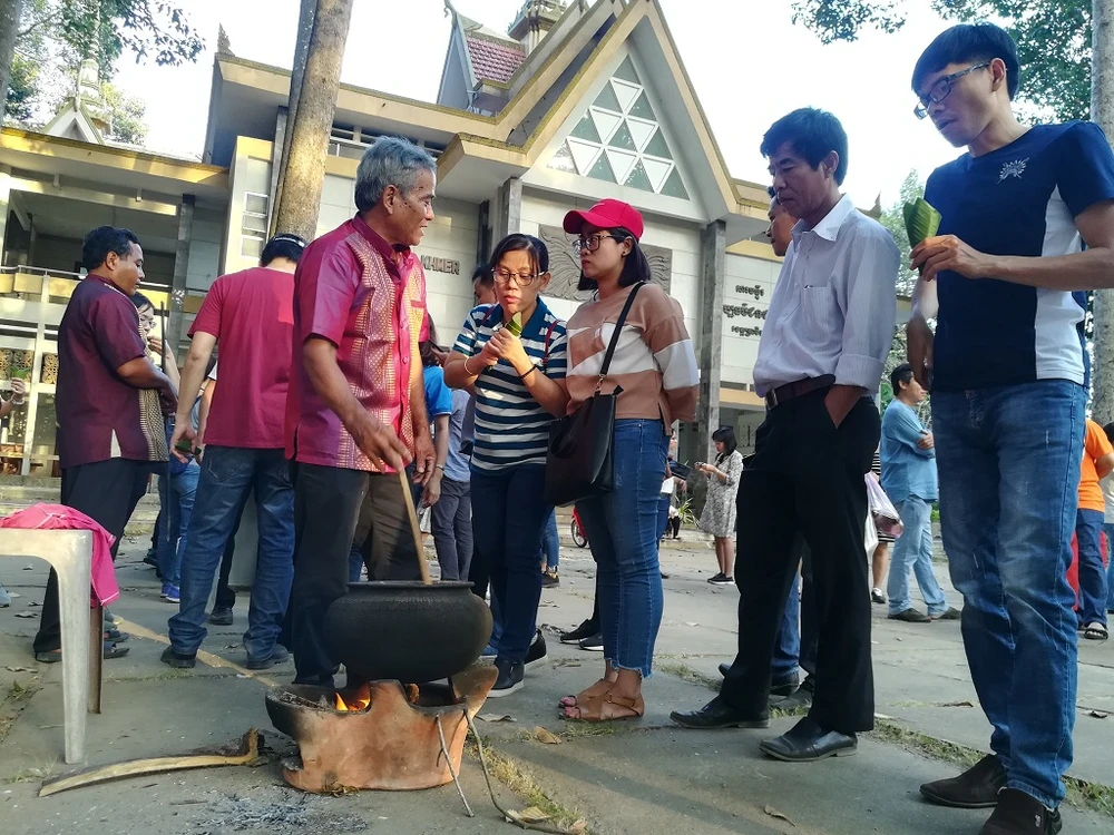Ông Thạch Sang, một người Khmer có kinh nghiệm làm cốm dẹp nhiều năm, trực tiếp tái hiện lại cảnh giã cốm dẹp cho du khách khi đến Bảo tàng văn hoá dân tộc Khmer cho biết, cốm dẹp là một món ăn truyền thống của người Khmer.