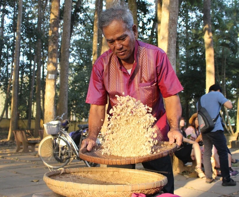 Khi mùa nếp chín tới thời điểm ngon nhất thì người Khmer mới làm cốm dẹp để giữ được hương vị ngon nhất của nếp. ẢNH: LÊ THOA.