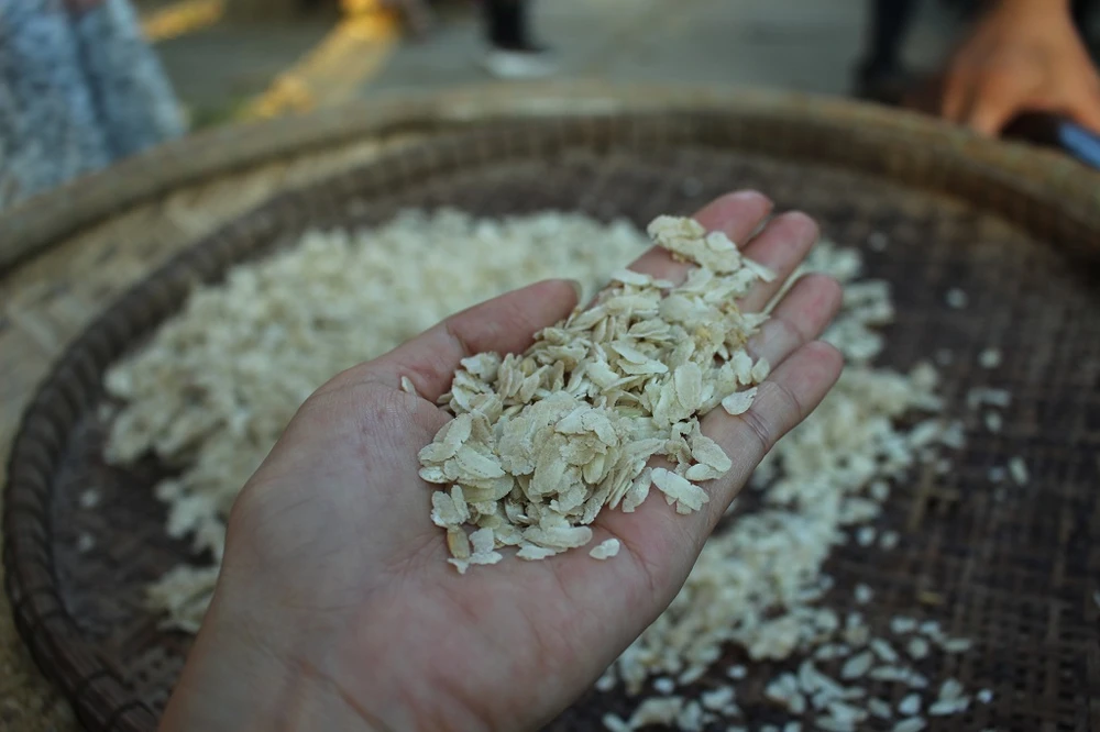 Ông Sang cho hay, nếp là nguyên liệu chính để làm cốm dẹp. Chính vì vậy mà vào tháng 10 âm lịch, khi mùa nếp chín tới thời điểm ngon nhất thì người Khmer mới làm cốm dẹp để giữ được hương vị ngon nhất của nếp. Cốm mới quết rất giòn và dẻo, ăn ngay cũng đã cảm nhận được hương vị đặc trưng, khoái nhất là mùi cám vẫn còn vương lại nơi đầu mũi.