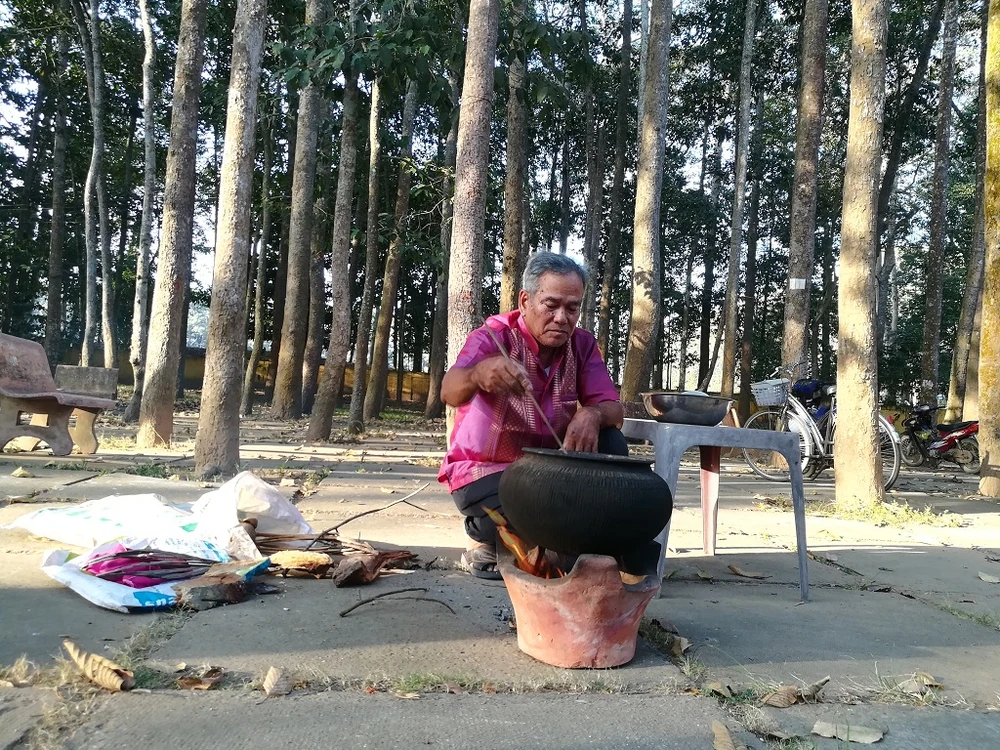 Ông Sang cho biết, cái nồi để rang nếp đã được gia đình ông truyền qua nhiều thế hệ nên rất quý. ẢNH: THANH TUYỀN.