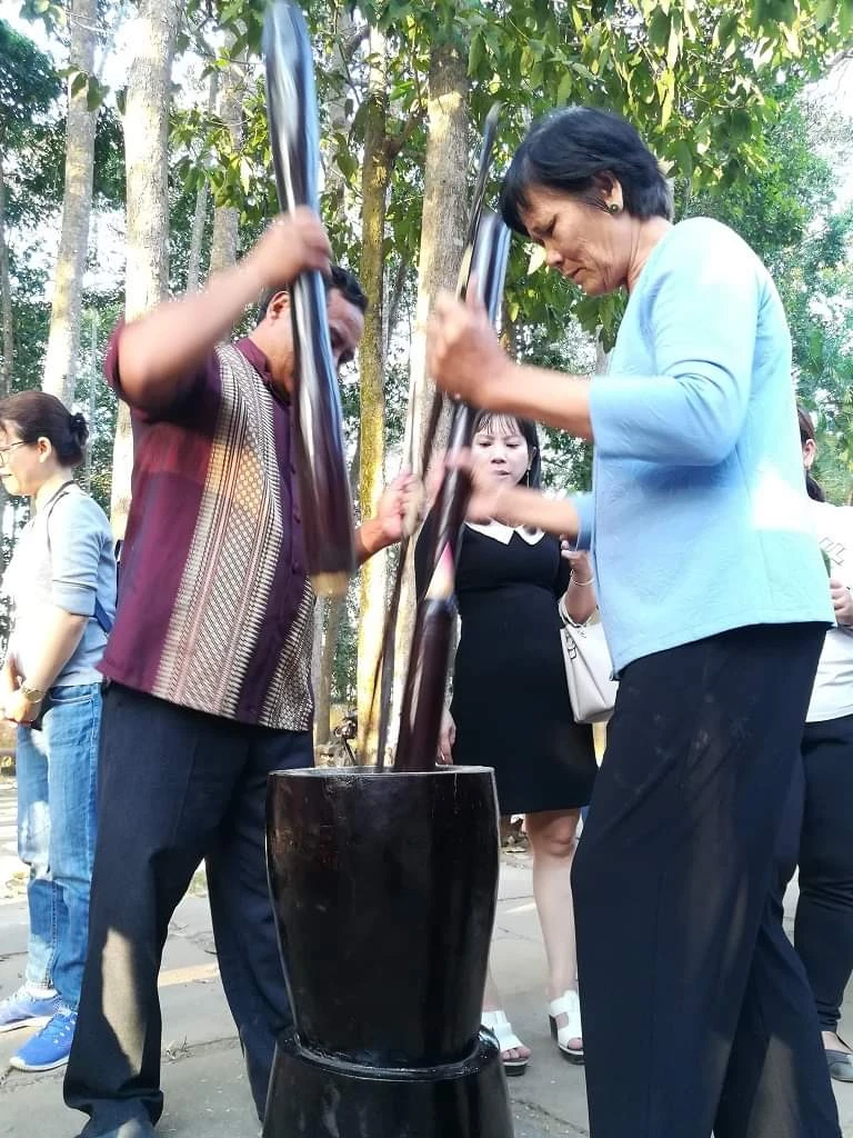 Sau khi rang nếp thì bắt đầu giã. Cách giã là hai người đứng đối diện, thay phiên nhau giã cho hột nếp dính chày rớt xuống cối để giã tiếp. Trong ảnh, du khách đang trải nghiệm công đoạn giã nếp. ẢNH: LÊ THOA.