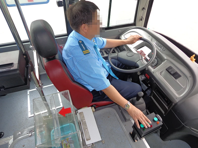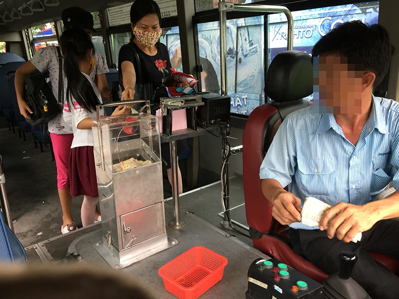 Tại trạm xe buýt Bến Thành, PV bước lên xe buýt tuyến số 01 Bến Thành - Chợ Lớn. Trên xe buýt, ở vị trí ngang tầm tay phải của tài xế có gắn hộp đựng tiền, hộp số bấm in vé (cho các loại vé 2.000 đồng, 5.000 đồng, vé tập, vé miễn) và máy in vé. Tài xế giải thích cơ chế hoạt động bán vé tự động đơn giản như máy bốc số thứ tự đặt ở các công sở, ngân hàng, bệnh viện... Hành khách làm thao tác bỏ tiền (đúng mệnh giá) vào thùng, bấm nút và cầm vé in ra từ máy.