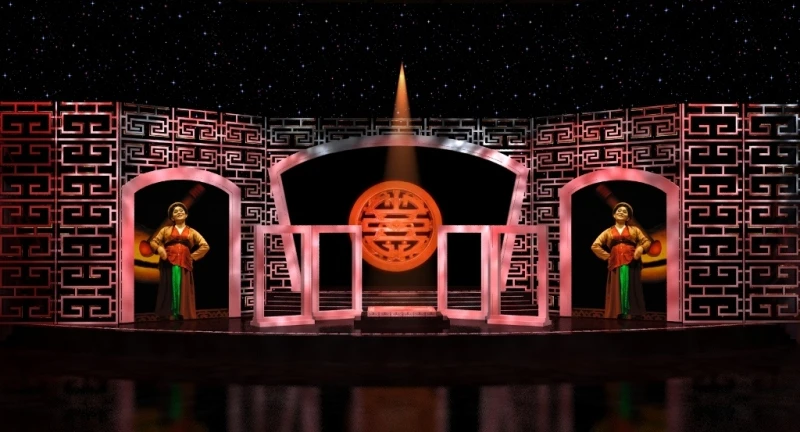 Không gian biểu diễn được kiến tạo mô phỏng sân khấu chèo truyền thống nhưng mang đậm hơi thở đương đại.