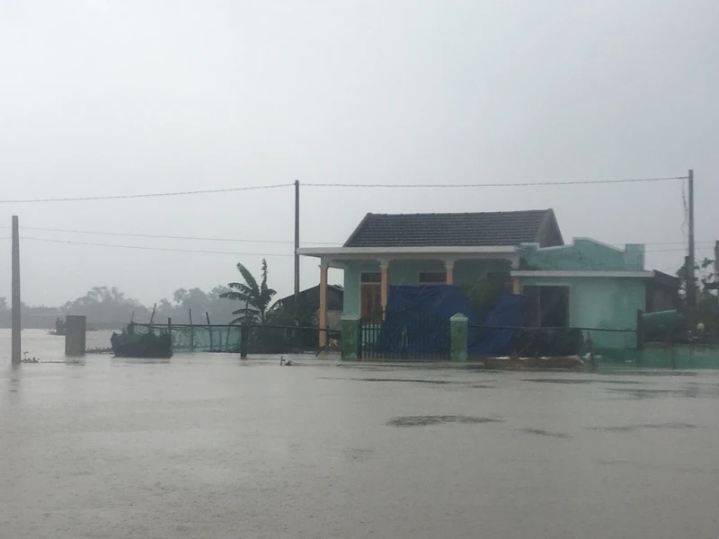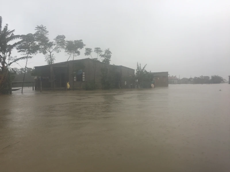 Ngày 6-11, mực nước lũ trên các sông tại Thừa Thiên - Huế đang giảm dần, nhưng vẫn còn ở mức trên báo động 2. Nước lũ tại một số vùng trũng vẫn đang bị ngập lụt, nhiều người dân phải di dời vẫn chưa thể quay trở về nhà. Ảnh: NGUYỄN DO