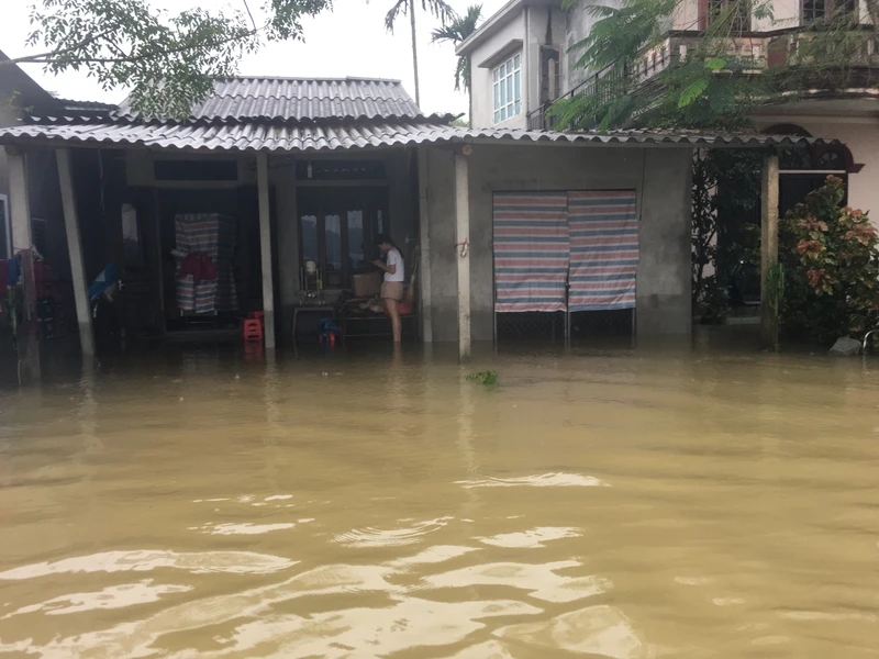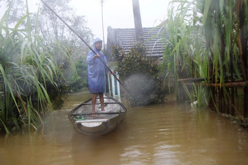 Nhiều ngôi nhà tại huyện Quảng Điền đang bị ngập sâu, mọi sinh hoạt trong gia đình bị đảo lộn. Một số tuyến đường ngập đến 1 m, mọi đi lại điều nhờ vào thuyền. Ảnh: NGUYỄN DO