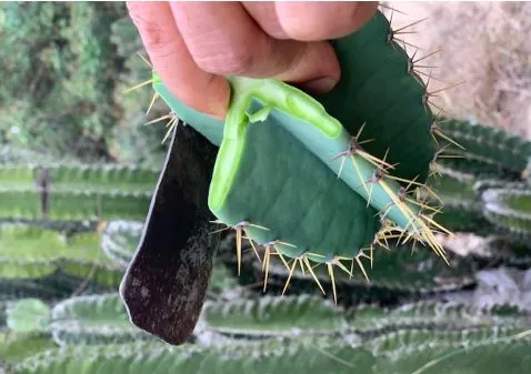 Cái đọt nõn đó họa hoằn trong bụi xương rồng lớn chỉ có hai đến ba đọt. Màu xanh non khác biệt giữa những đọt già, hớt phần trên xanh non đó và khéo léo cho tay vào bốn góc trong thỏi xương rồng gọt hết bốn đường gai chĩa bốn bên nhưng phải cẩn thận chứ không gai chích vào tay.