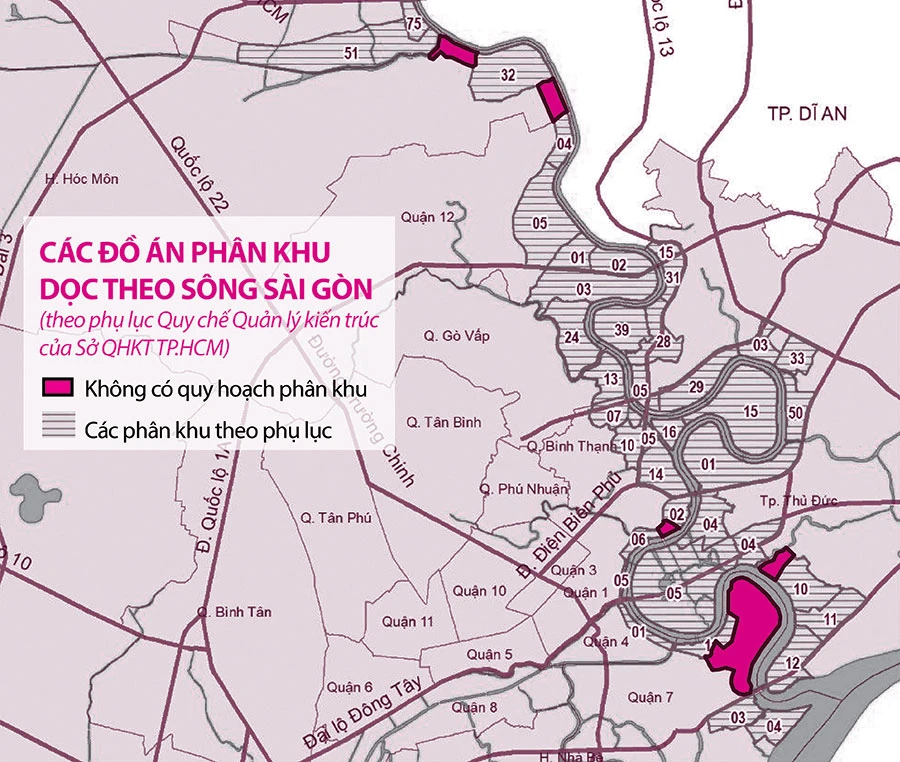 Trong phụ lục Quy chế quản lý kiến trúc TP.HCM, khu vực ven sông Sài Gòn được xếp đầu tiên. Trong đó, hình ảnh quy hoạch sông Sài Gòn phủ kín các đồ án quy hoạch kéo dài qua tám quận, huyện, TP Thủ Đức, chỉ còn năm khu vực không có đồ án quy hoạch phân khu.