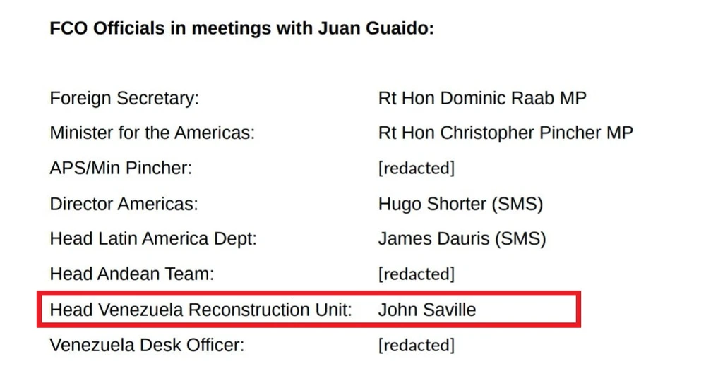 Danh sách những quan chức Anh đã gặp ông Juan Guaido hồi tháng 1, trong đó có "người đứng đầu Đơn vị Tái thiết Venezuela: John Saville" . Ảnh: THE CANARY