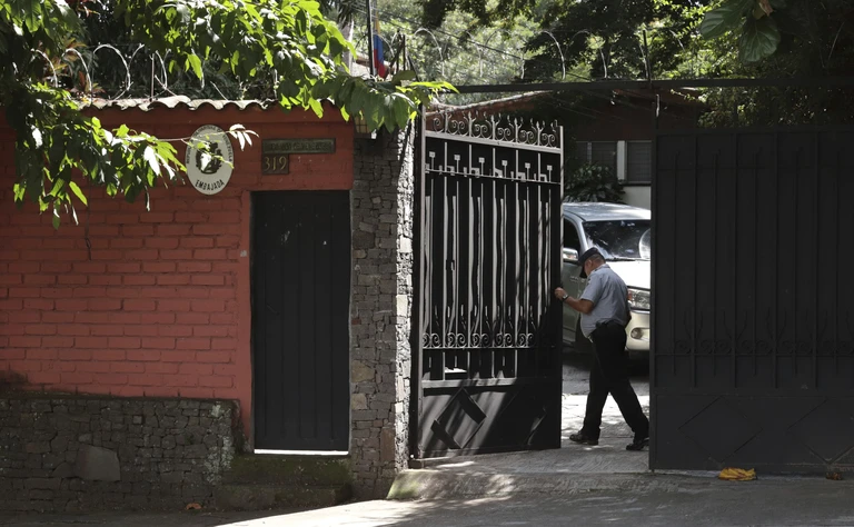 Bên ngoài Đại sứ quán Venezuela tại El Salvador, các nhà ngoại giao lần lượt rời đi ngày 3-11. Ảnh: AP