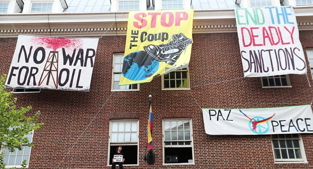 Các nhà hoạt động Mỹ đã sinh hoạt bên trong đại sứ quán Venezuela từ khoảng 2 tuần nay. Ảnh: SPUTNIK