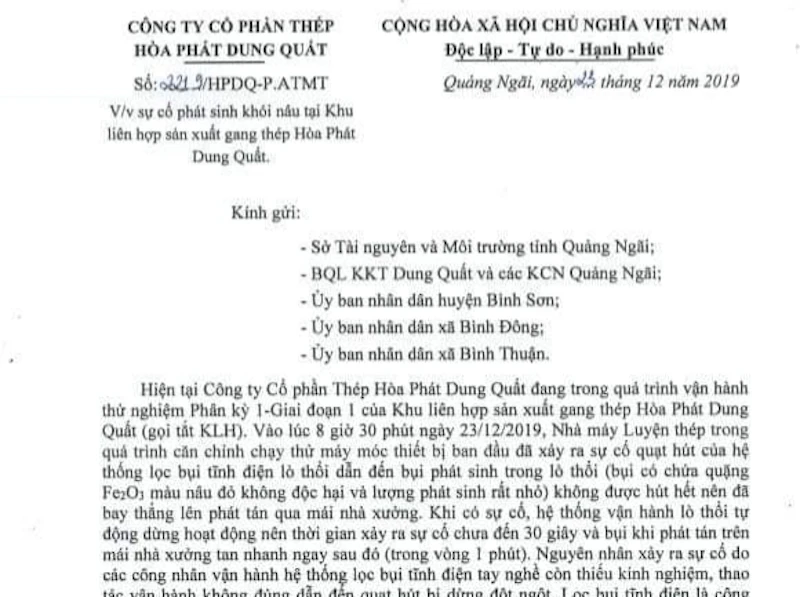 Cùng ngày, ông Hồ Đức Thọ, Phó Giám đốc Công ty cổ phần Thép Hòa Phát Dung Quất, đã có văn bản gửi Sở TN&MT tỉnh Quảng Ngãi, Ban quản lý (BQL) Khu kinh tế Dung Quất và Khu công nghiệp Quảng Ngãi, UBND huyện Bình Sơn, UBND xã Bình Thuận và UBND xã Bình Đông về việc này.