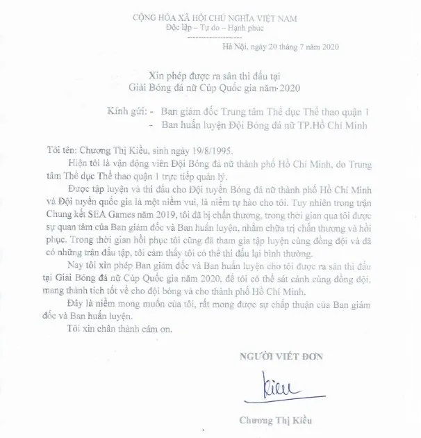 Nay tôi xin phép Ban giám đốc và Ban huấn luyện cho tôi được ra sân thi đấu tại giải bóng đá nữ cúp quốc gia 2020, để tôi có thể sát cánh cùng đồng đội, mang thành tích tốt về cho đội bóng và cho đơn vị TP.HCM. Đây là niềm mong muốn của tôi, rất mong được sự chấp thuận của Ban giám đốc và Ban huấn luyện. Tôi xin chân thành cảm ơn!”.