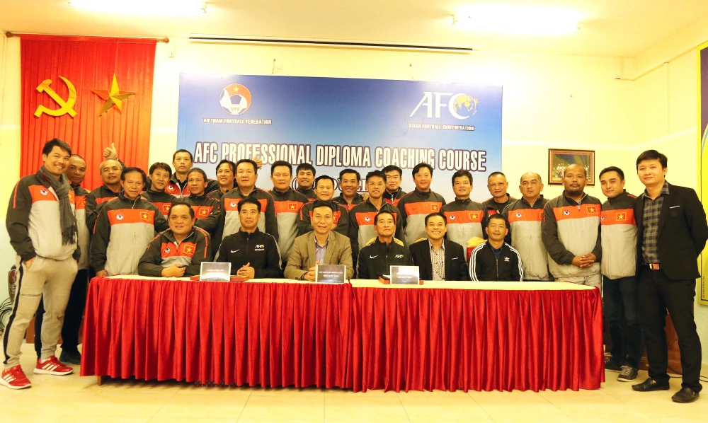 Ông Yusuke (hàng ngồi, thứ hai bên trái) tại lễ cấp bằng HLV chuyên nghiệp của AFC. Ảnh: VFF