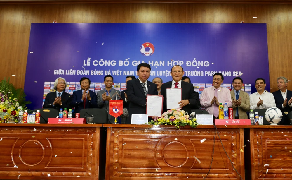 Thầy Park ký bản hợp đồng mới tiếp tục đồng hành cùng bóng đá Việt Nam. Ảnh: NGỌC DUNG