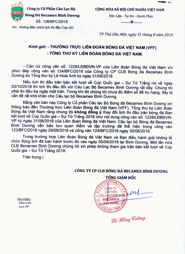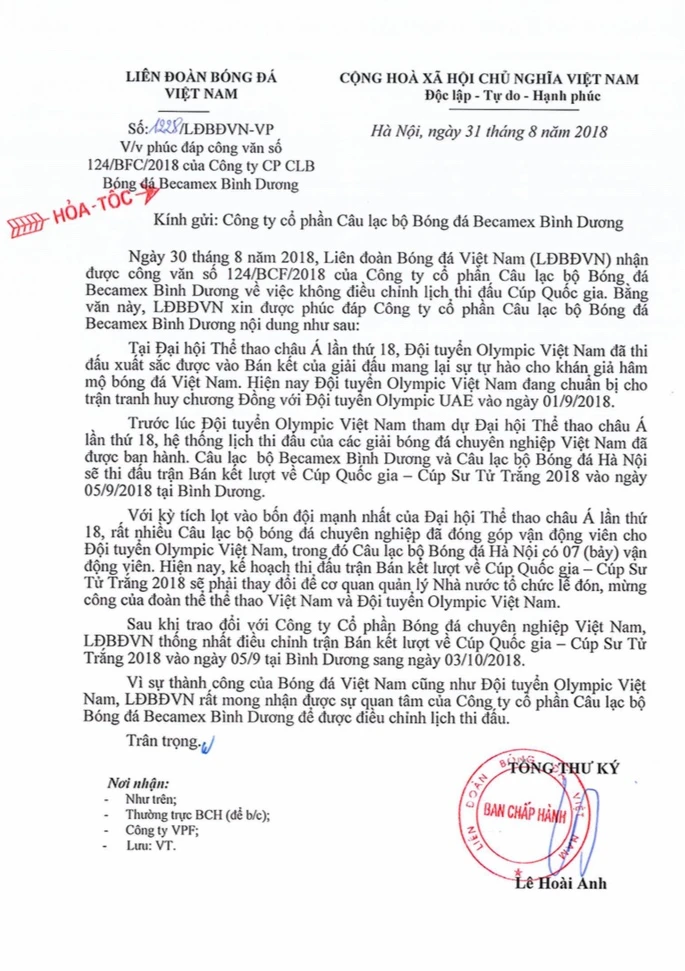 Trong khi đó, phía B. Bình Dương hai lần khẳng định việc đổi lịch từ ngày 5-9 sang ngày 3-10 đá trận bán kết lượt về với Hà Nội là “bất hợp lý và không có tính xây dựng”. Đáng nói là công văn đổi lịch do Tổng Thư ký VFF Lê Hoài Anh ký vào ngày 31-8, chỉ một ngày trước trận tranh hạng ba của thầy trò Park Hang-seo, nghĩa là VFF không tính đến việc đội Olympic Việt Nam vào sâu hoặc quá chủ quan với suy đoán của mình.