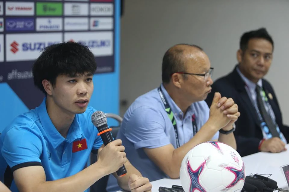 Công Phượng theo thầy Park họp báo sau trận thắng Lào 3-0. Ảnh: NGỌC DUNG