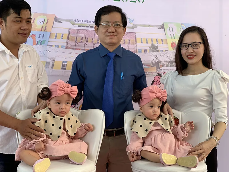 TS-BS Lê Thanh Hùng cùng gia đình hai bé Trúc Nhi, Diệu Nhi ngày xuất viện. Ảnh: H.LAN