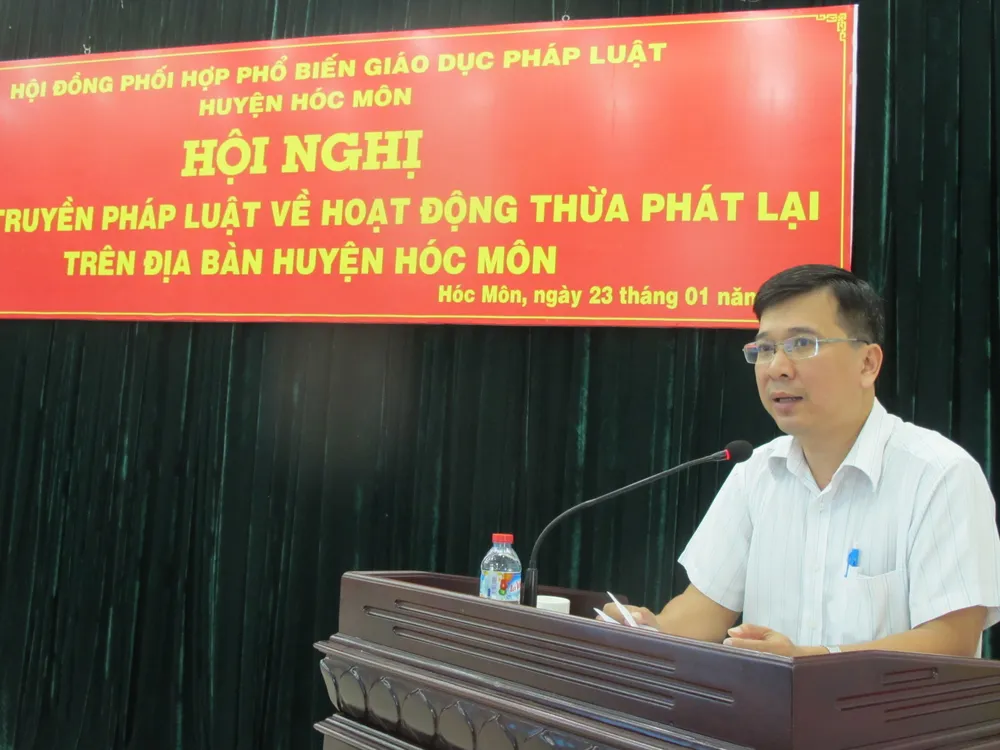 Ông Phan Thanh Tùng, Trưởng Phòng bổ trợ tư pháp-Sở Tư pháp TP.HCM, là báo cáo viên của hội nghị. Ngoài việc tuyên truyền, phổ biến các quy định về chế định và hoạt động thừa phát lại thì hội nghị này đặc biệt thông tin về giá trị pháp lý của việc lập vi bằng nhằm tránh tình trạng ngộ nhận vi bằng có giá trị tương tự văn bản công chứng, chứng thực.