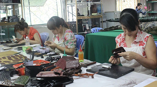 Công ty của anh Tôn Thất Hưng hiện đang sản xuất các mặt hàng bóp, dây nịt, túi xách xuất khẩu. Ảnh: Hoàng Giang
