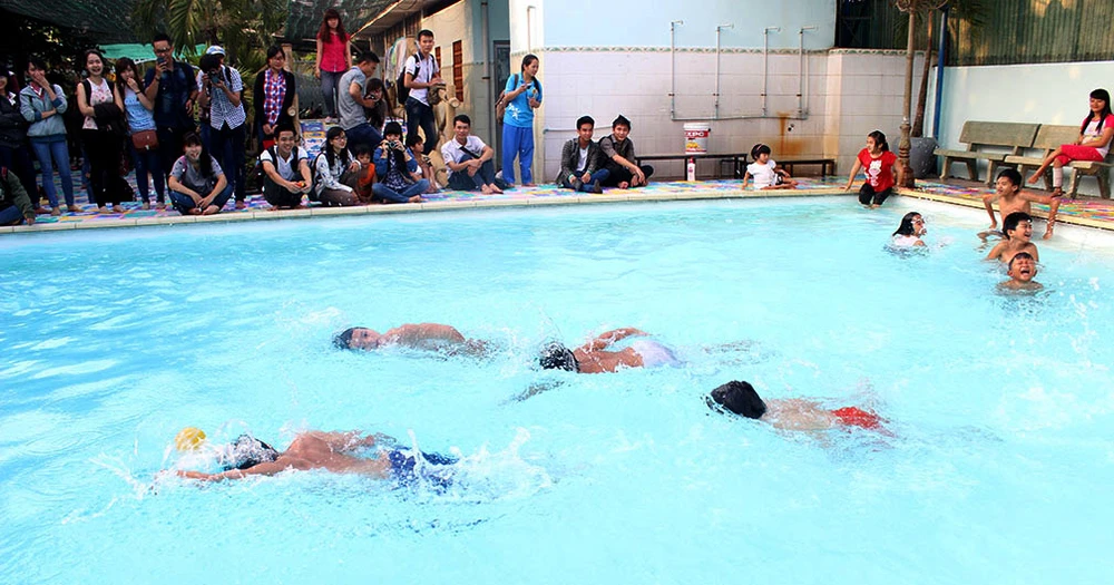 Những đứa trẻ mắc bệnh xương thủy tinh được điều trị bằng cao xương cá sấu đã có thể đi học, vui chơi và bơi lội bình thường. Ảnh: Hoàng Giang