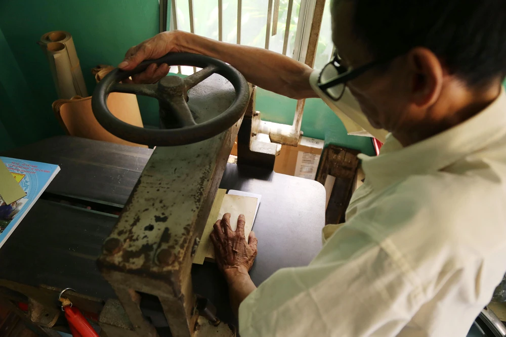 Đồ nghề của ông Rạng chỉ đơn giản gồm có hồ, kim chỉ và một chiếc máy cắt giấy được ông chủ xưởng in bán lại hơn 20 năm trước.