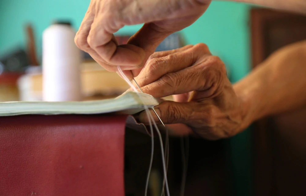 Ông Rạng cẩn thận may từng đường chỉ để giữ chặt các trang sách lại trước khi làm bìa cứng.