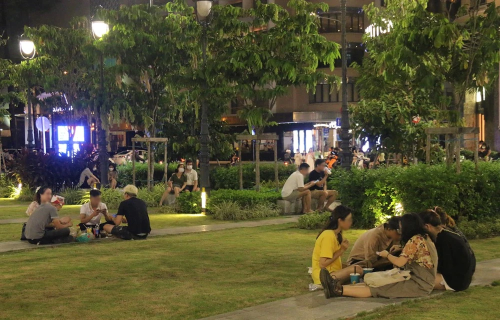 Buổi tối ngày cuối tuần, mọi người đến phố đi bộ Nguyễn Huệ tụ tập ăn uống, hát hò rất đông. Ảnh: THẢO PHƯƠNG