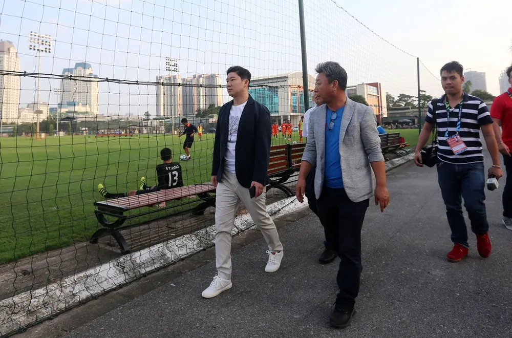 Jin Jong Oh bước vào sân tập giao lưu với các tuyển thủ Việt Nam.