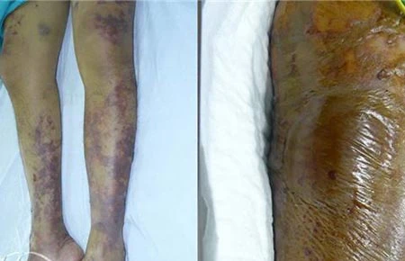 Nhưng ba ngày sau, chỗ vết thương sưng nề làm anh bị sốt nhẹ. Ngày thứ tư, hai khớp gối và bắp chân cảm thấy đau nhức, anh V. tới BV địa phương điều trị nhưng triệu chứng trên không bớt; thậm chí hai bắp chân sưng nề, da chuyển màu xanh tím, dấu hiệu hoại tử. BV địa phương chuyển bệnh nhân đến BV Bệnh nhiệt đới Trung ương.