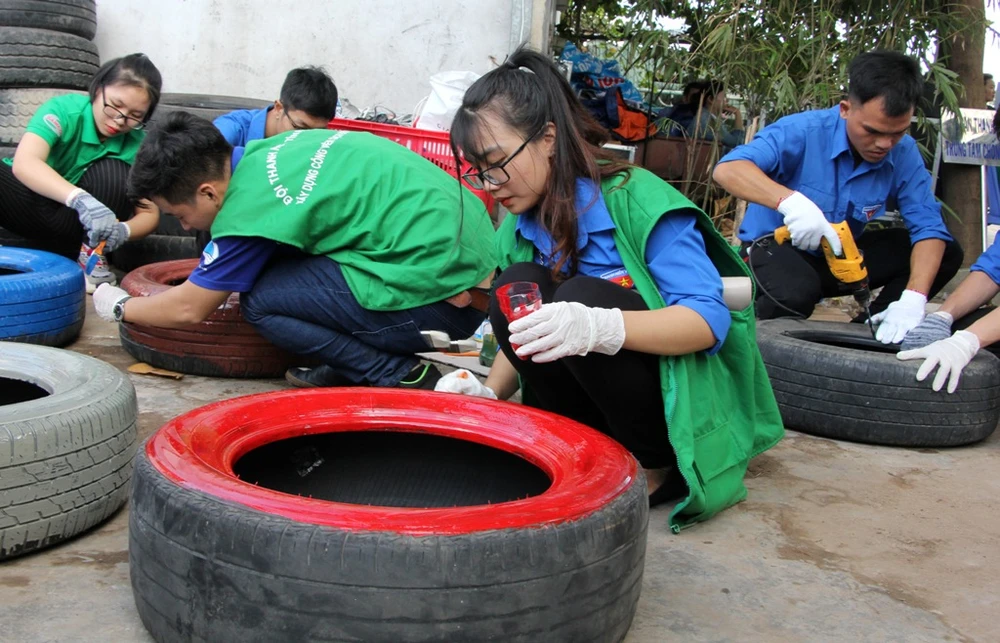 Các bạn đoàn viên thanh niên đang tái chế những vỏ xe cũ để trang trí cho công viên được làm từ những vật dụng tái chế.