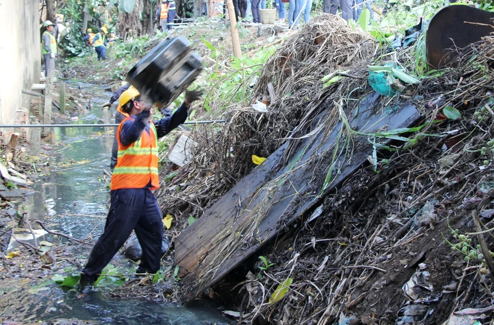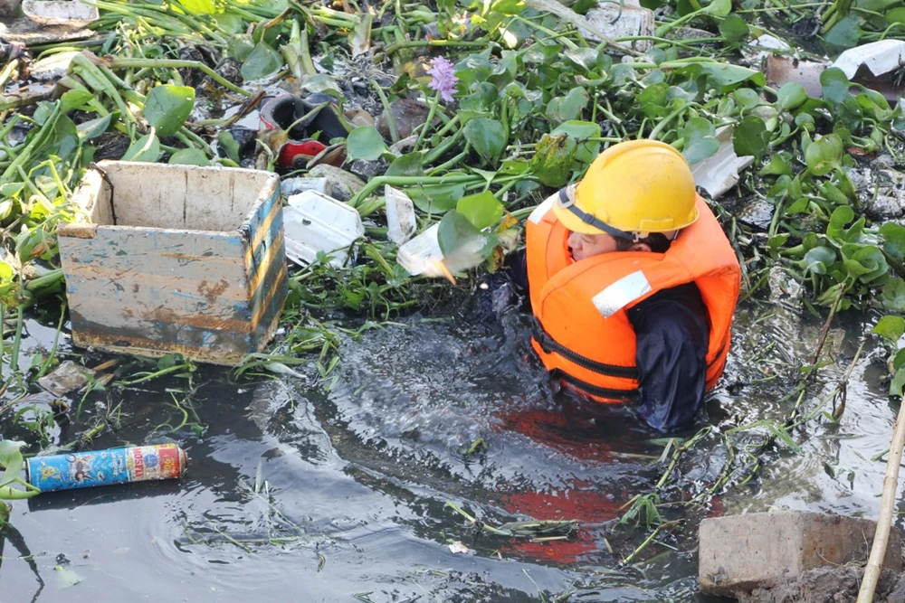 Kênh Rạch Lăng ngập ngụa rác và lục bình đang được các công nhân nạo vét, khơi thông dòng chảy.