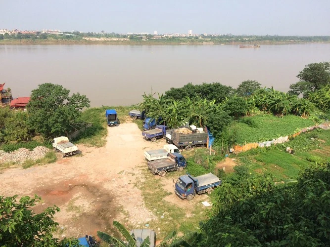 Khu vực ven Sông Hồng gần cầu Chương Dương bị lấn chiếm, san lấp để làm bãi đỗ xe tải