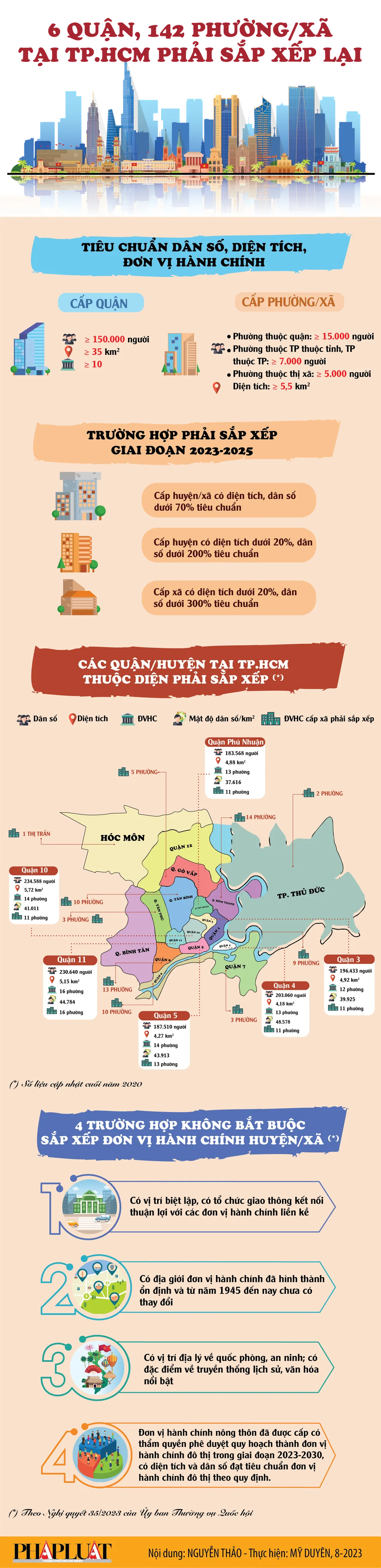 (PLO)- Theo tính toán, hiện TP.HCM có sáu quận là 3, 4, 5, 10, 11, Phú Nhuận phải sắp xếp lại trong giai đoạn 2023-2025 do không đủ tiêu chuẩn về diện tích theo quy định. Cạnh đó là 142 đơn vị hành chính cấp xã cũng thuộc diện sắp xếp lại.
