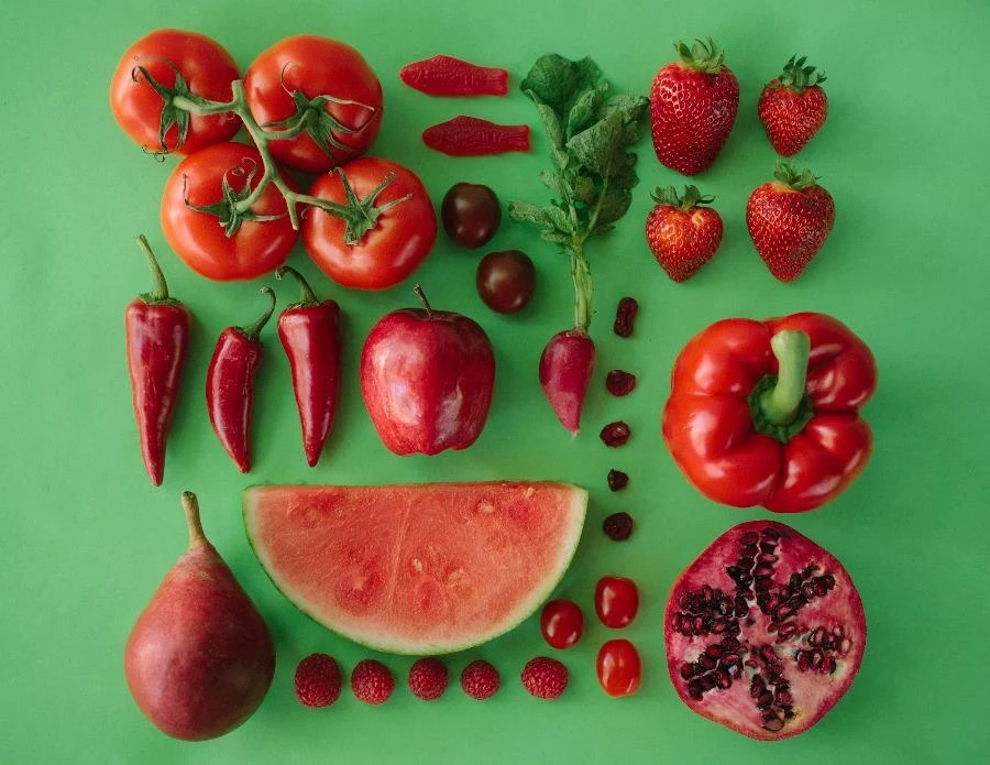 Các loại rau củ quả có màu đỏ thường chứa các chất dinh dưỡng thực vật như lycopene và anthocyanins, có thể giúp bảo vệ chống lại một số bệnh ung thư nhất định, giảm nguy cơ tiểu đường, hỗ trợ sức khỏe mắt và cải thiện sự xuất hiện của da. Để tăng lượng thức ăn màu đỏ, ăn những thứ như: cà chua, củ cải đỏ, dưa hấu, ớt đỏ, dâu tây, quả mâm xôi...