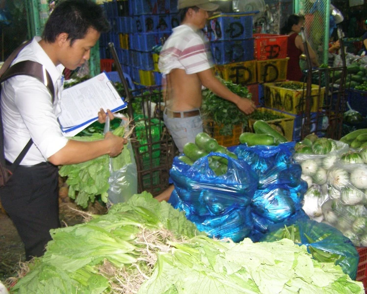 Trong quá trình lấy mẫu rau xét nghiệm, cơ quan chức năng chưa thể tạm giữ toàn bộ lô hàng. Ảnh: TRẦN NGỌC