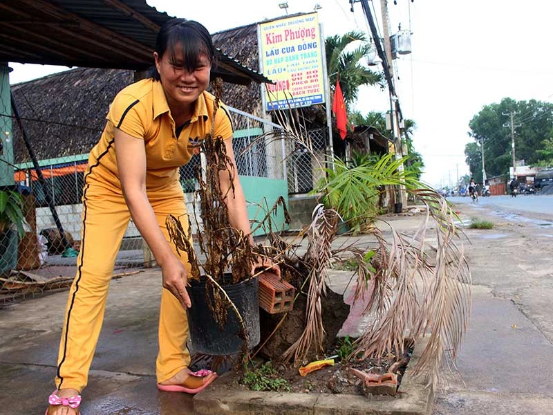 Chị Nguyễn Thị Hỏe dọn dẹp chậu cây lấn vỉa hè trước quán cà phê của mình. Ảnh: LÊ THOA