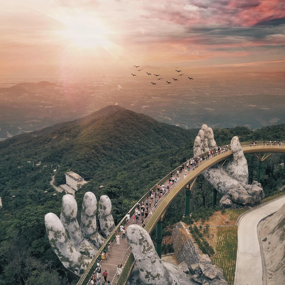 Tiếp đến phải kể đến cây cầu Vàng trên đỉnh Bana Hills. Nằm ở độ cao hơn 1.400m so với mực nước biển, cầu dài đến 150 m, rộng 12,8 m và có tổng cộng 8 nhịp. Được thiết kế như hình đôi bàn tay nâng đỡ một dải lụa vàng lơ lửng giữa tầng mây, đây là địa điểm thu hút rất nhiều du khách trong và ngoài nước đến tham quan.