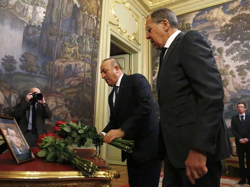 Ngoại trưởng Thổ Nhĩ Kỳ Mevlut Cavusoglu (trái) và Ngoại trưởng Nga Sergei Lavrov (phải) đặt hoa viếng lễ tang của cố đại sứ Karlov. Ảnh: AP