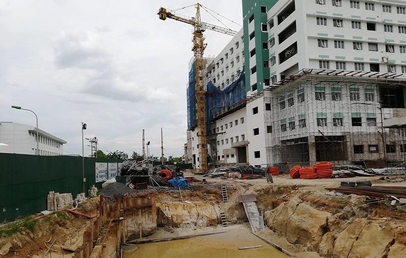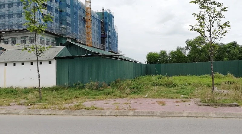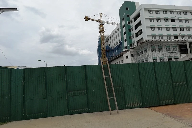 Phía trong hàng rào tôn đóng ngang đường là công trình bệnh viện đang xây dựng dở dang.