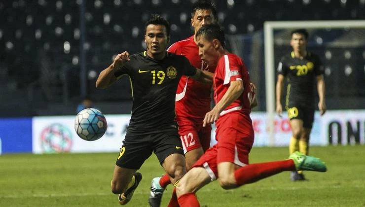 Tuyển Triều Tiên (đỏ) đánh bại Malaysia ở hai lượt trận đi và về vòng loại Asian Cup trên sân trung lập Buriram ở Thái Lan.