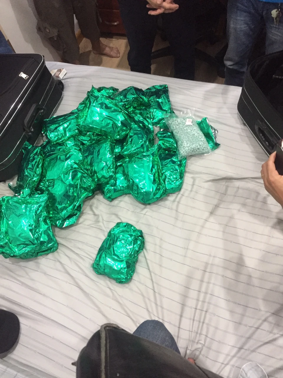 Tang vật công an thu giữ khi bắt giữ Đồng Dương Nam là 100.000 viên thuốc lắc (tương đương 35 kg ma túy tổng hợp) được ngụy trang khéo léo, gói thành từng gói nhỏ màu xanh. Ảnh: CA cung cấp