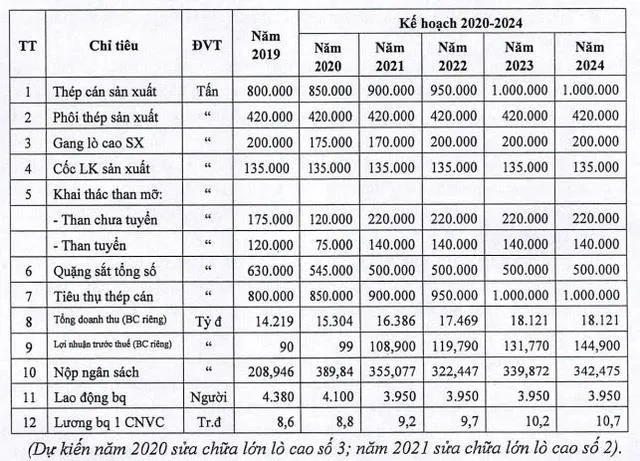 Đặt kế hoạch cho năm 2019, tổng doanh thu Công ty mẹ dự đạt 14.219 tỷ đồng, lợi nhuận trước thuế 90 tỷ đồng, tiền lương bình quân 8,6 triệu đồng/người/tháng, sản xuất 800.000 tấn thép cán, 420.000 tấn phôi thép và 200.000 tấn gang lò cao. So với thực hiện 2018, doanh thu kế hoạch 2019 của Tisco tăng 29,7% trong khi lợi nhuận trước thuế giảm 50%.